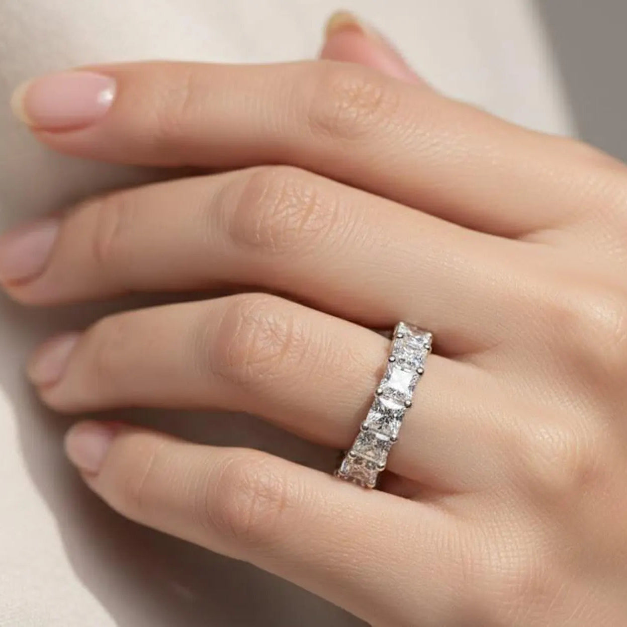 Princess eternity bands offer brilliance with a strong architectural feel.