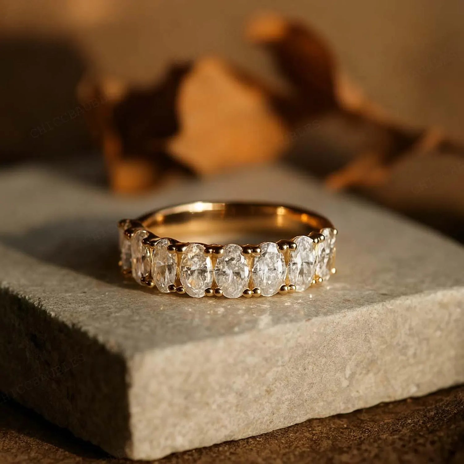 An oval half eternity ring showcases elegantly elongated oval-cut diamonds set across the upper half of the band. Their graceful proportions enhance brilliance while creating a flattering, fluid silhouette.