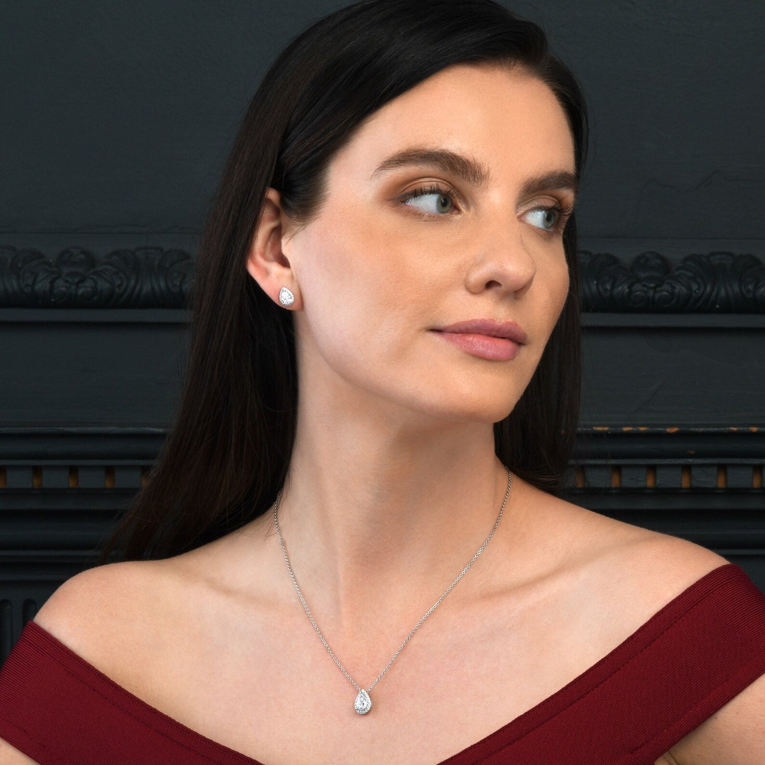 Gracefully elongating the neckline, this pear-shaped halo pendant features a teardrop central diamond encircled by glittering accents. Its unique silhouette catches light beautifully, enhancing the décolletage with feminine sophistication. Offered in white or yellow gold, with natural or lab-grown diamonds, it radiates refined elegance and alluring glamour.