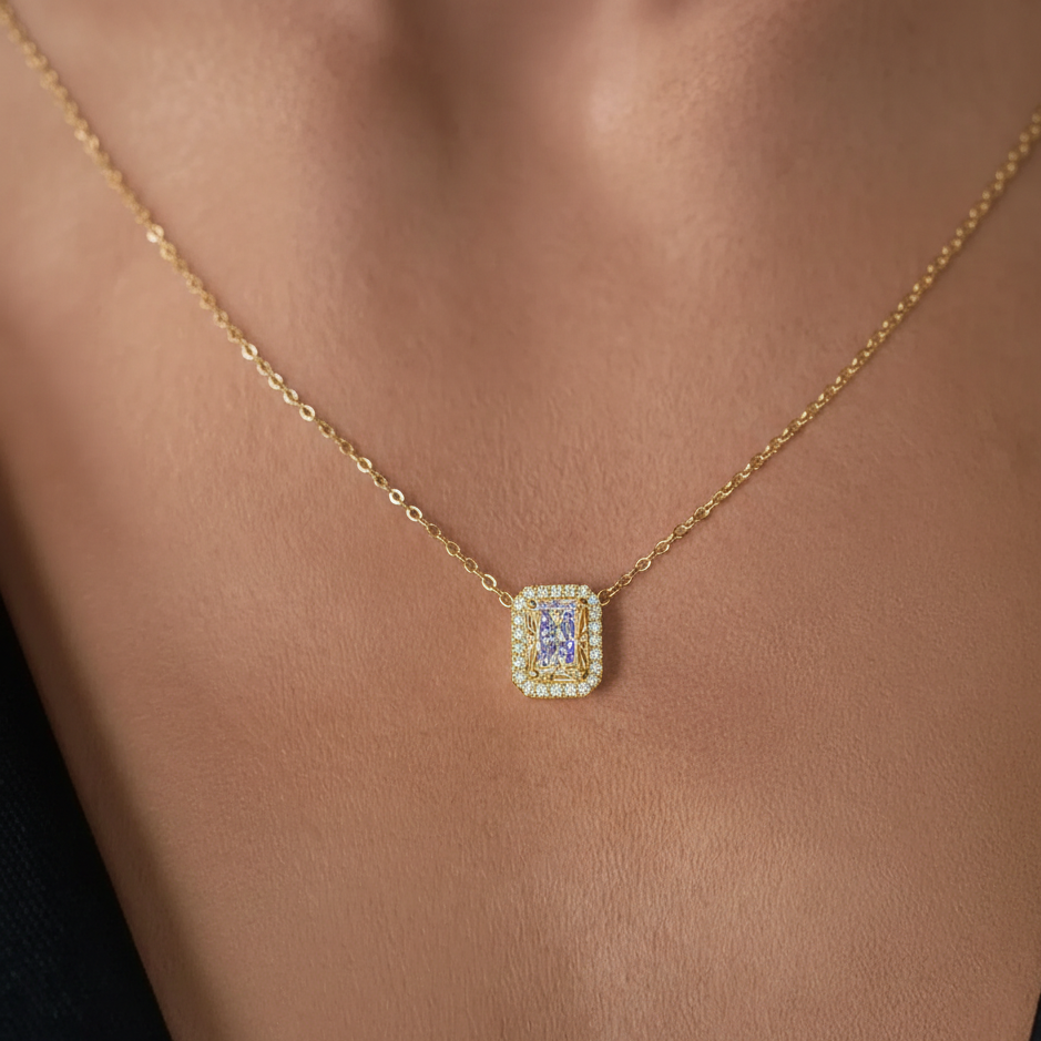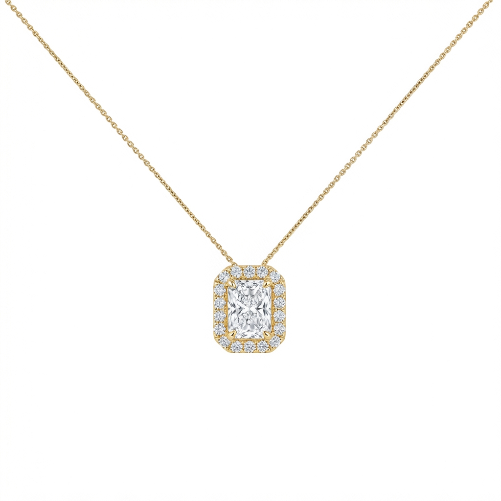 Brilliant and contemporary, this radiant halo pendant showcases a rectangular-cut central diamond encircled by a sparkling halo. Its combination of elegance and sparkle illuminates the neckline beautifully. Available in white or yellow gold, with natural or lab-grown diamonds, it exudes modern sophistication and luminous allure.