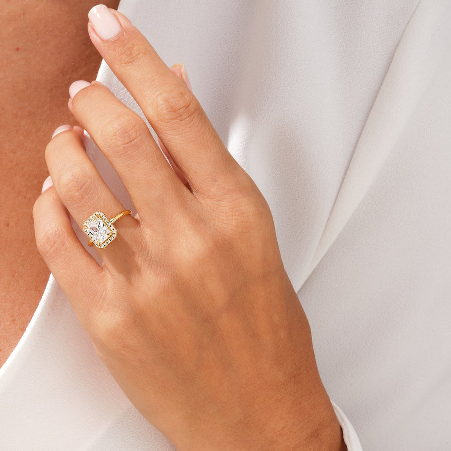 Combining the luminosity of brilliant cuts with structured lines, the radiant cut offers contemporary elegance. The halo setting amplifies light without overwhelming the design.
