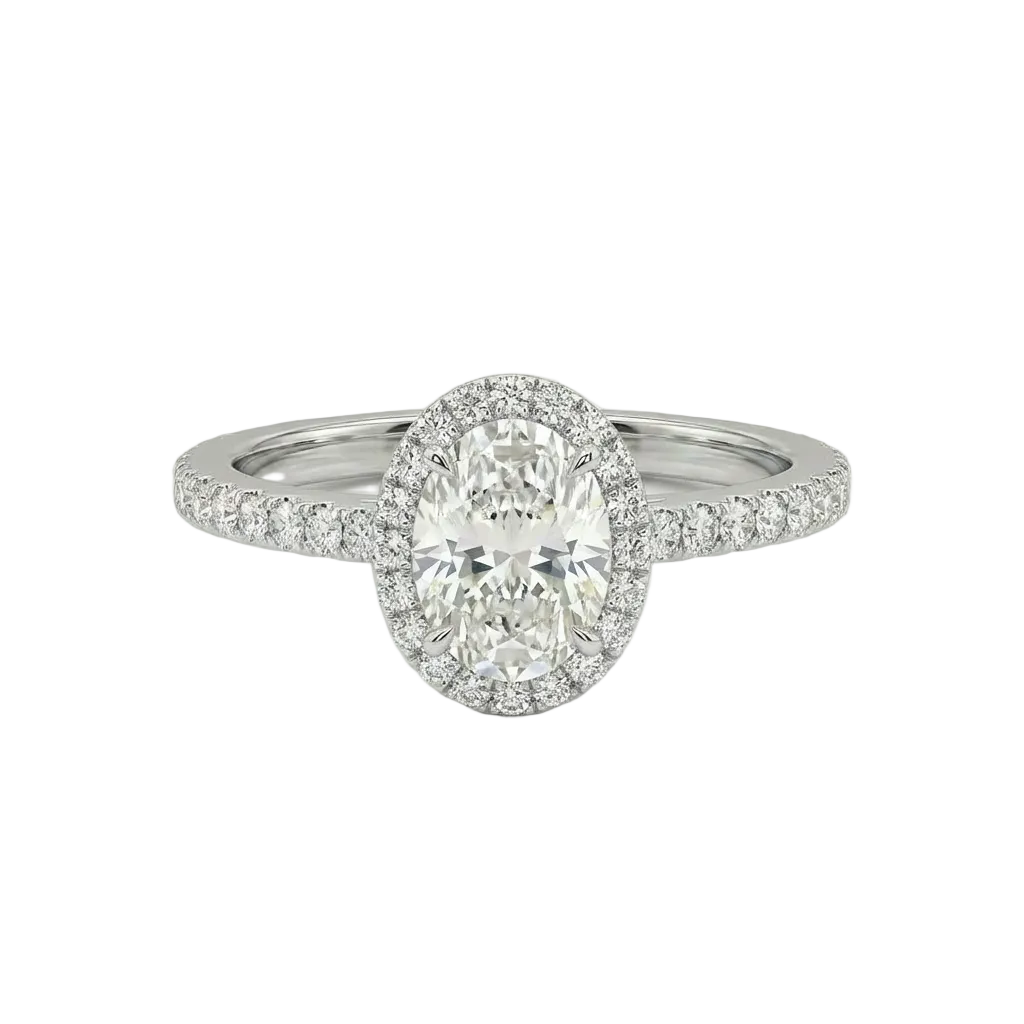Chosen by those who love elegance with a modern twist, this oval-cut solitaire with halo and pavé represents timeless, graceful, and vibrant love.